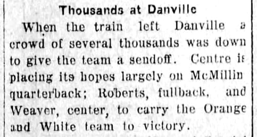 Boyle County had a population of 14,998 in the 1920 census, of which 6,000 lived within the city limits of Danville. Over 4,000 people were at the Southern Railroad's little brick station to see the team off on Thursday morning. Classes were delayed at Centre and K.C.W. so that the faculties and students could be at the station. The public schools were likewise closed for the morning. Businesses had signs on the doors and in the windows that they'd open after the "Harvard Special" pulled out, because, "We are at the station, and you should be, too!"