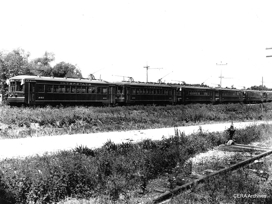 Interurban train carrying DePauw team from Greencastle to Indianapolis. Interurbans were self-propelled electrified trains and ran regular schedules between cities. They were mostly discontinued in the 1930's as improved highways and the increase in cars made them not financially viable.