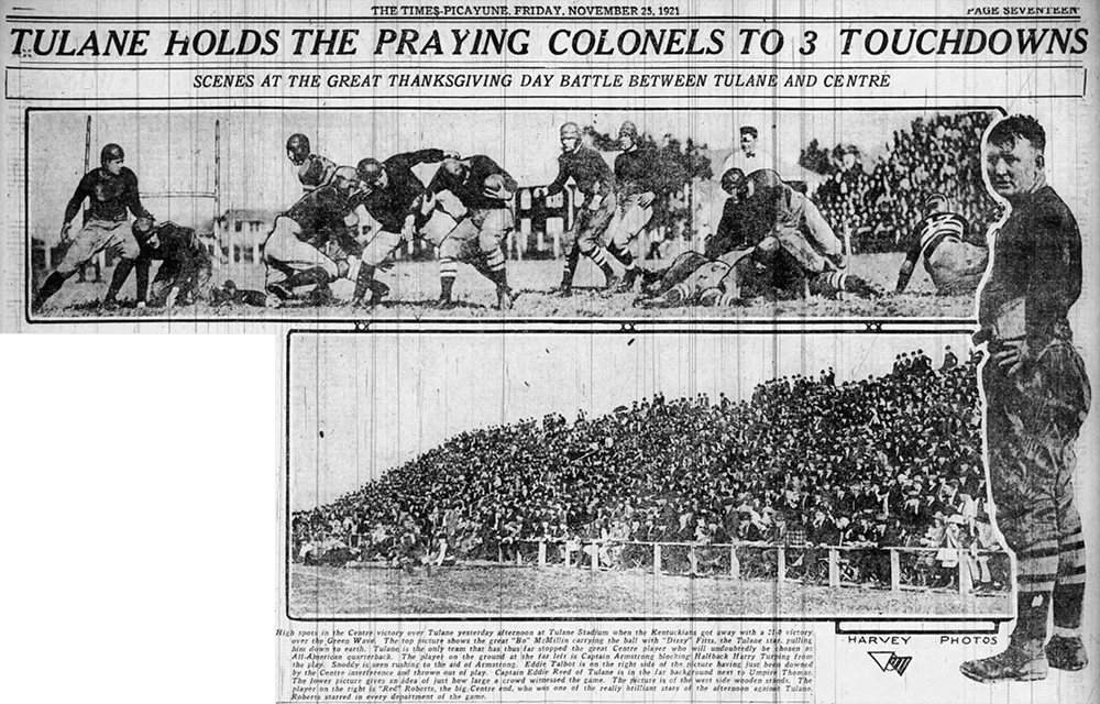 Significant was the fact that Tulane " holds the Praying Colonels to only 3 touchdowns." Red Roberts is shown to the right. The sellout crown shows that there were even people standing at the top of the stadium due to all of the 10,000 seats being filled.