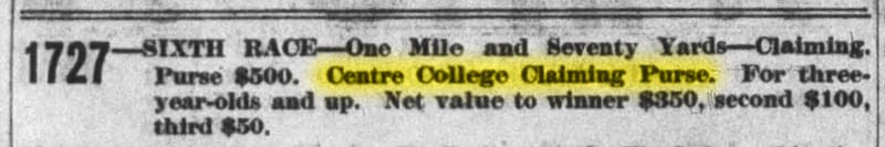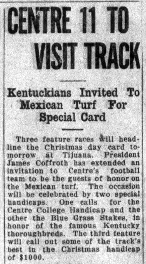 The acceptance by Uncle Charlie to bring his team to the track had prompted publicity in the "Union," which had been tipped off by the Coronado management and it was announced that 2 races would be run in honor of the Colonels, the "Centre College Handicap," and the "Bluegrass Stakes," in honor of the "Kentucky Thoroughbreds."