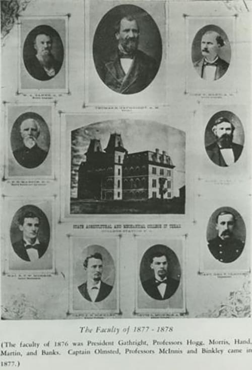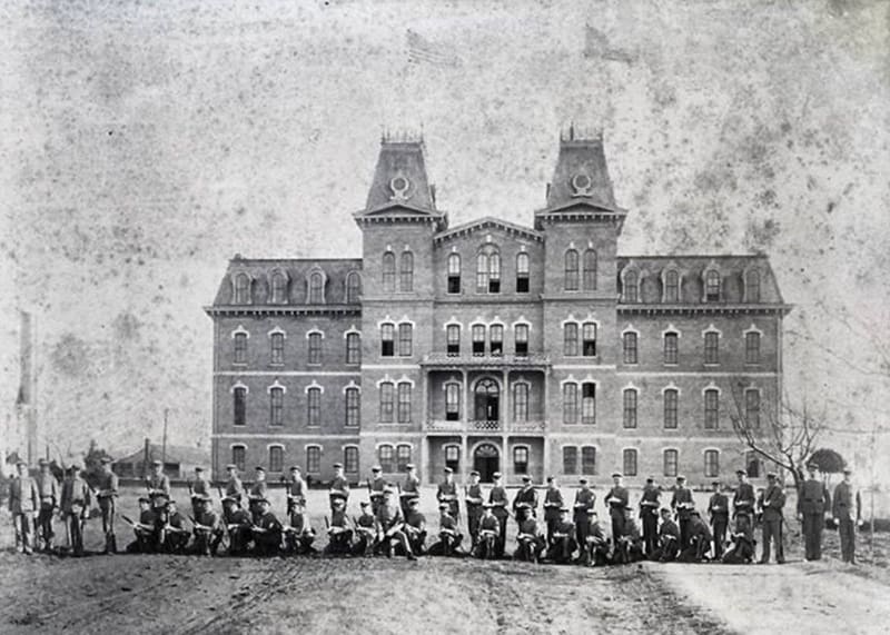 The original A&M building, "Old Main," constructed in 1875. It burned in 1912, and was replaced on the same site by the "Academic Building," now the oldest building on the campus. This photo is from 1894 with a company of cadets lined up.
