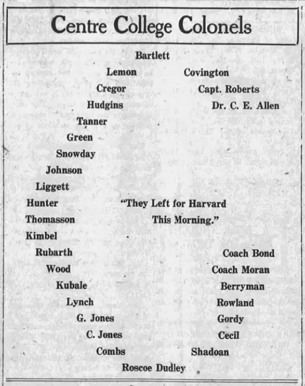 Everything seemed on schedule. Classes had been cancelled at both Centre and K.C.W. Businesses didn't plan on opening until the Colonels were off, and the usual huge crowd, including Governor Morrow, was at the station ready to stage a boisterous and enthusiastic sendoff. The team, coaches, and trainer were packed and ready to head to Boston for the third year.